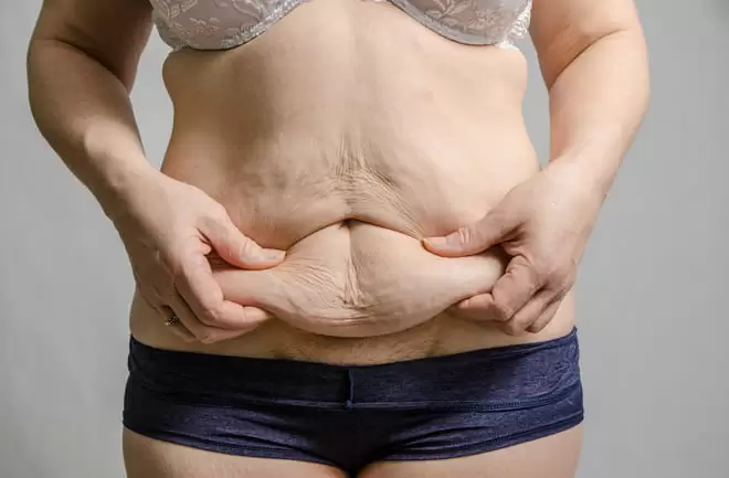 - Excesso de pele no abdômen, braços, coxas ou mamas;